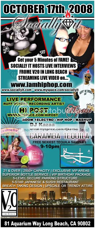 That’s right! Mark your calendars! This event is going to be crazy FUN, FUN, FUN! Socially It and the Socially “It” girls will be broadcasting LIVE on iamhiphop.com/mstv at club V20 in Long Beach Oct 17, 2008!